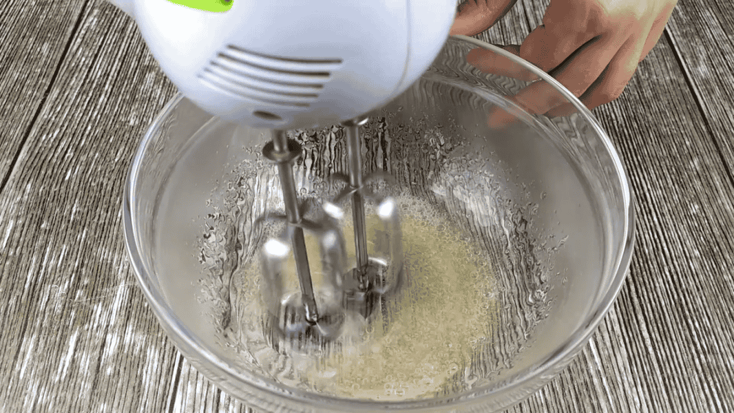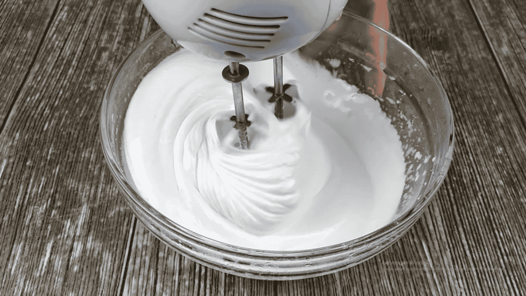Поступово маса побіліє та збільшиться в обсязі, стане глянцевою та щільною. Зовні вона нагадує заварний білковий крем. Збиваємо на середній швидкості, на це йде 8-10 хв.