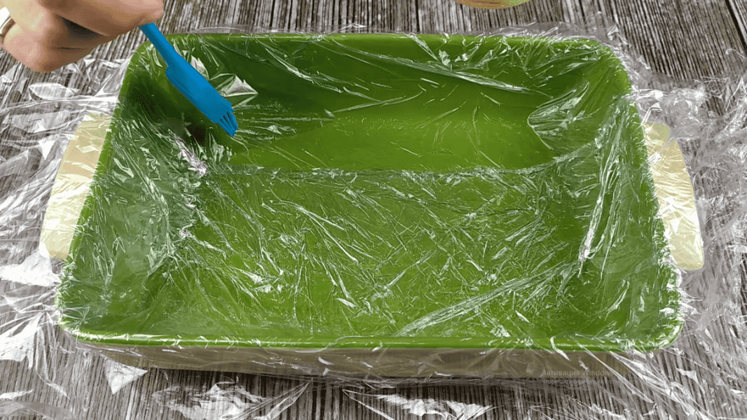 Форму 15*15 або 15*20 см змащуємо рафінованою олією. Покриваємо її харчовою плівкою у 2 шари. Залишаємо запас плівки з обох боків, щоб нею можна було накрити маршмеллоу зверху. Харчову плівку також повністю змащуємо рафінованою олією. Інакше маса прилипне до неї.