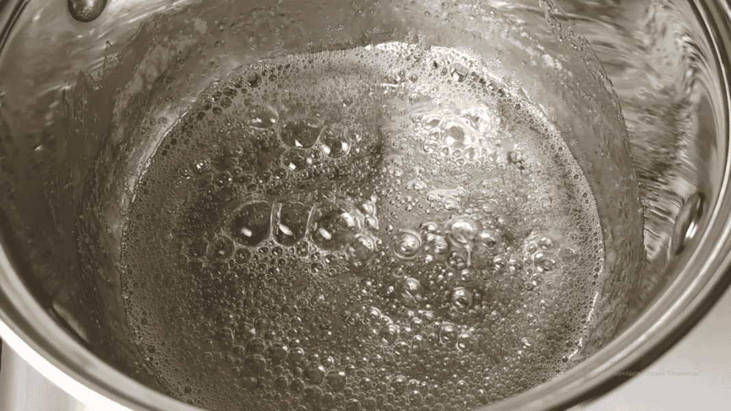 Варимо сироп на маленькому вогні, щоб розчинився весь цукор. Як сироп закипів і почав пінитися вимикаємо нагрівання.