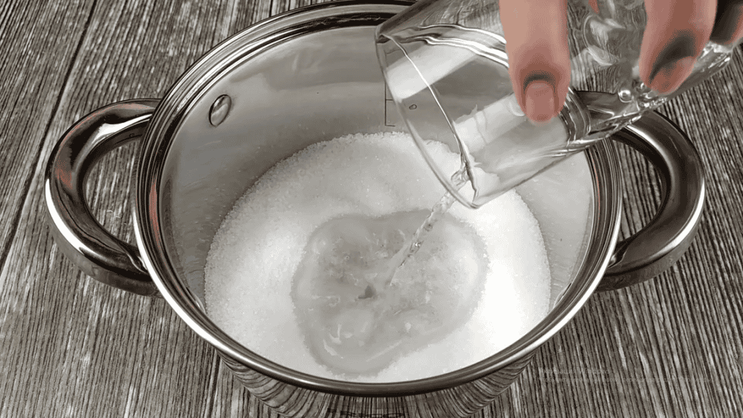 У каструлю з товстим дном висипаємо 220 г цукру, додаємо 1 ч. л ванільного цукру та щіпку солі. Перемішуємо. Вливаємо 60 мл води. Перемішуємо.