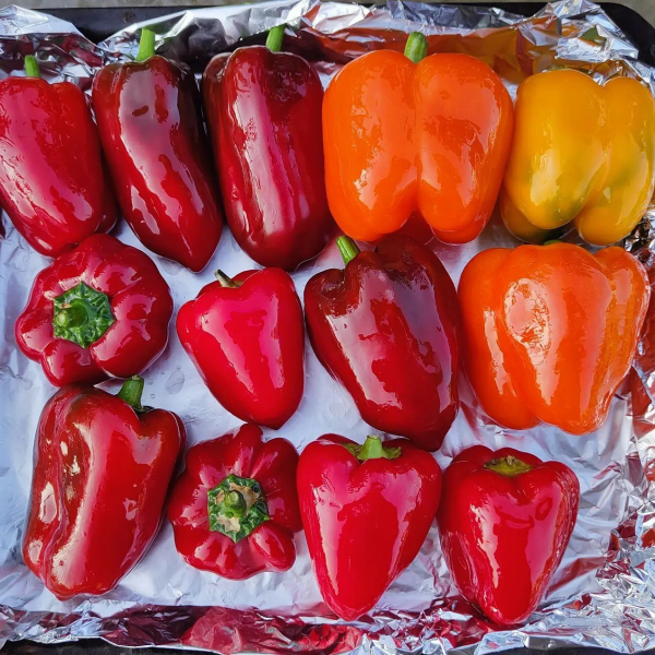 Солодкий перець помити та обсушити. Кожну перчину вмочити в олію (я змащую з усіх боків кулірнарним пензликом) і укласти на застелений фольгою або папером лист.