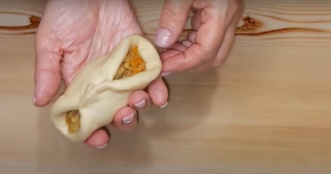 З кульок розкачую коржики і викладаю начинку. Формую пиріжки, щільно защіпаючи тісто.