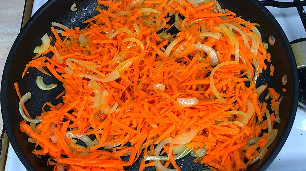 Чищу, мию і нарізаю півкільцями цибулю. Мию, чищу і пропускаю через велику терку моркву. З цибулі і моркви готую засмажку на олії.