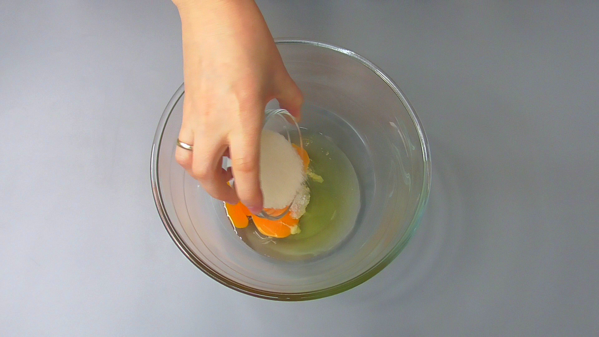 ✅ В яйця додаємо сіль, цукор, за бажанням — ванільний цукор, все добре перемішуємо.