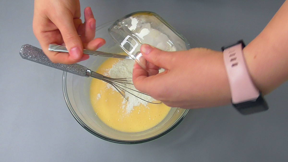 ✅ В окремій мисці змішуємо крохмаль з розпушувачем. Потім всипаємо його в рідку суміш, перемішуємо, щоб не залишилося грудочок і даємо масі постояти 15-20 хвилин.