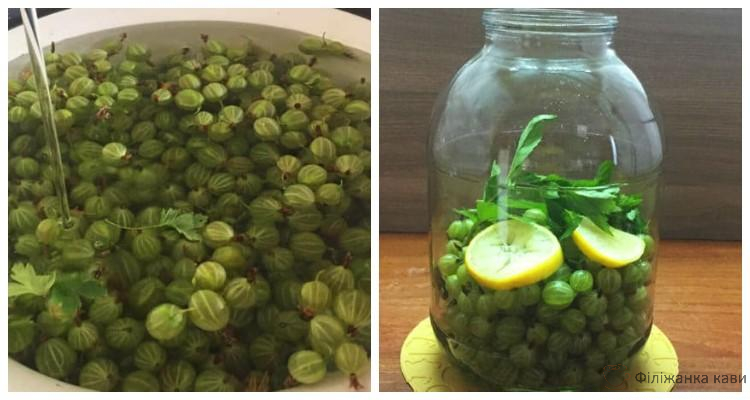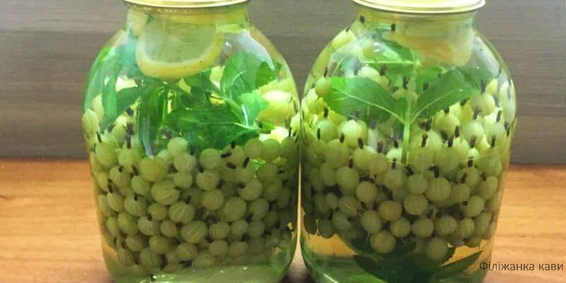 Обдайте чисті банки кип’ятком. Викладіть зелений аґрус, додайте м’яту і лимон.