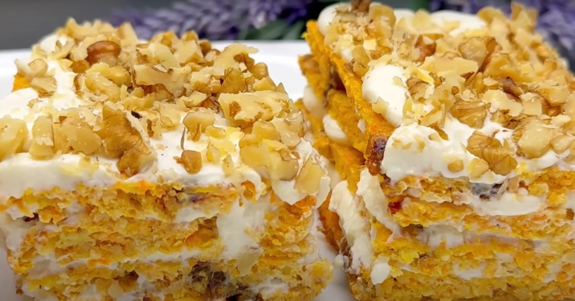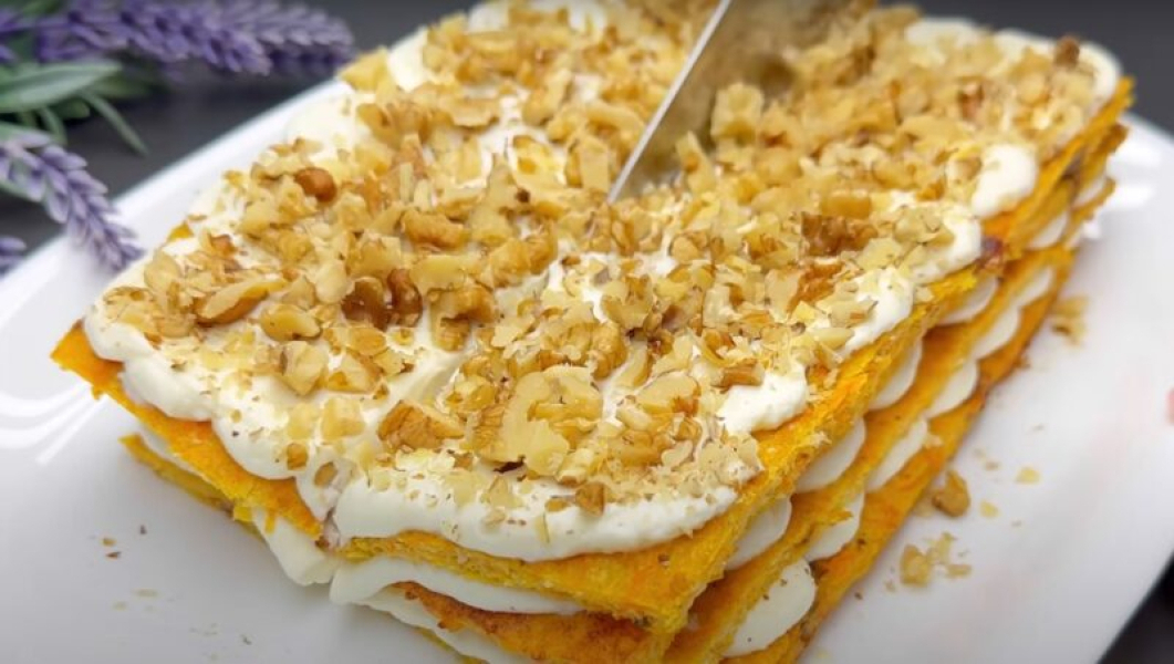 Для прикраси можна посипати верхівку пирога волоськими горіхами. Цей пиріг схожий на торт, має мало калорій і багато користі.