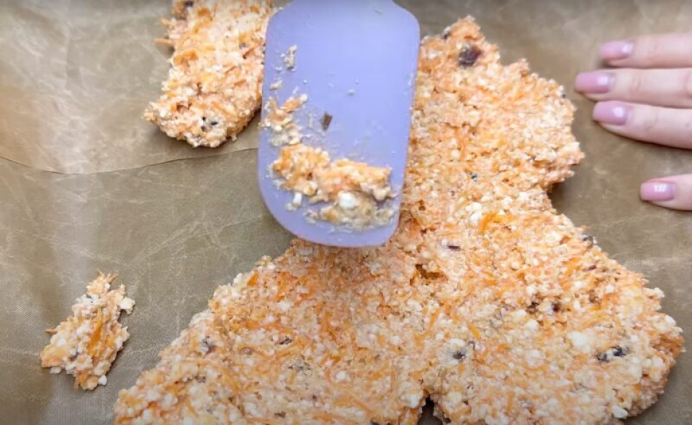 Натираємо на дрібній тертці моркву, очищаємо від зерен та дрібно нарізаємо фініки, змішуємо. Розбиваємо в морквяну суміш яйця, додаємо сир, вівсяні висівки та кунжутне волокно.