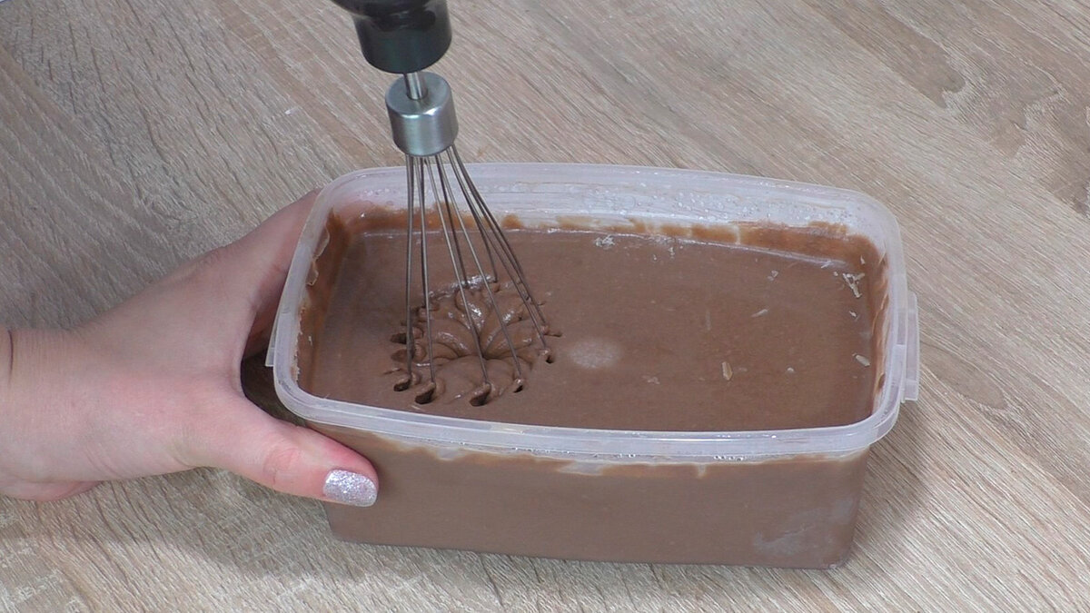 Кілька разів кожні 30 хвилин слід діставати контейнер і збивати суміш, розбиваючи кристалики льоду. Після чого знову прибирати в морозилку. Як тільки маса загусне, морозиво готове.