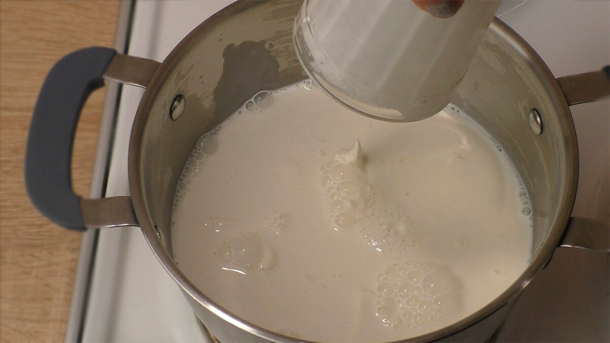 Змішуємо в каструлі 350 мл. молока і 250 мл. вершків 33% жирності і додаємо щіпку солі. Відправляємо на плиту і доводимо до кипіння.