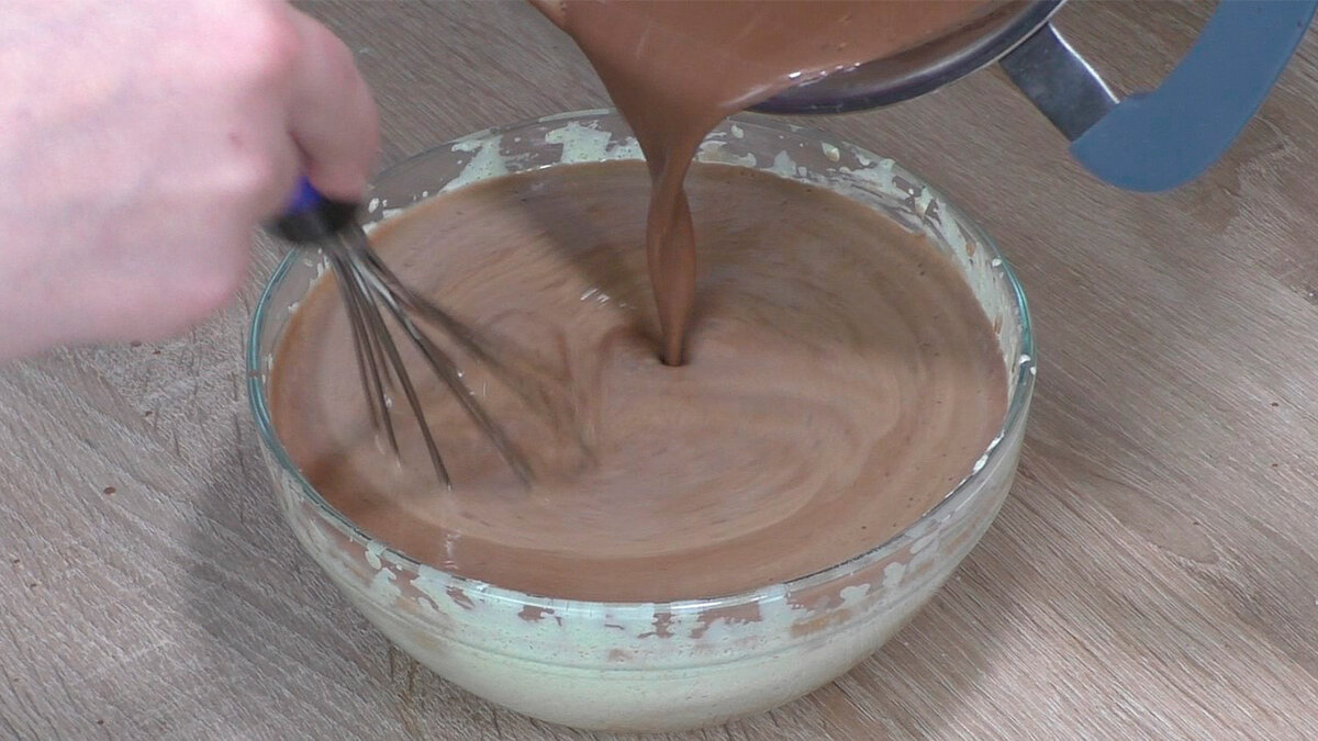 Далі сюди тоненькою цівкою вливаємо нашу гарячу шоколадну суміш і швиденько перемішуємо.