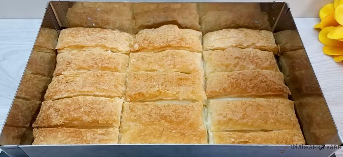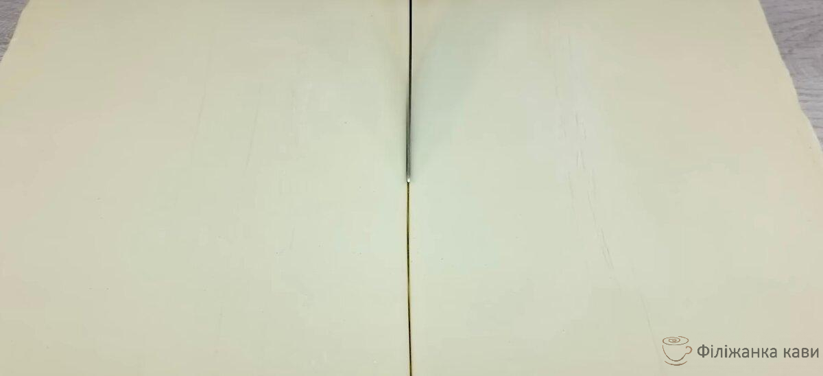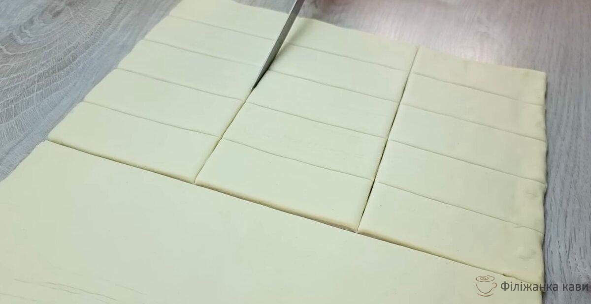 Робочу поверхню присипаємо борошном і викладаємо листкове тісто. Тісто теж присипаємо борошном і розгортаємо до розмірів 30-40 см. Розрізаємо на два рівних прямокутника.