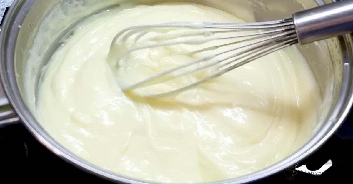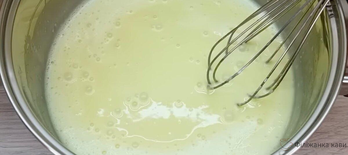 У каструлю кладемо яєчні жовтки і заливаємо вершками. Всипаємо ванільний цукор і змішуємо вінчиком.