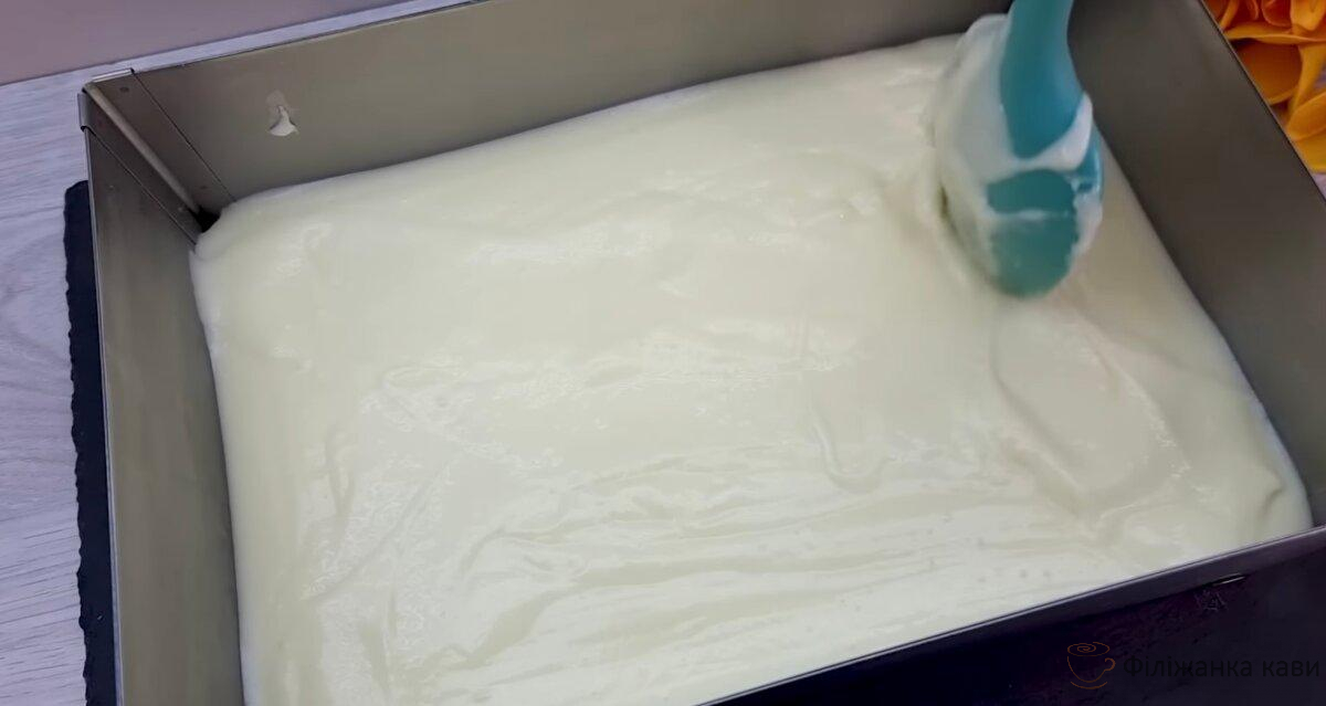 Зверху викладаємо розрізане на шматочки тісто. Ставимо торт в холодильник на 4-6 годин (до застигання).