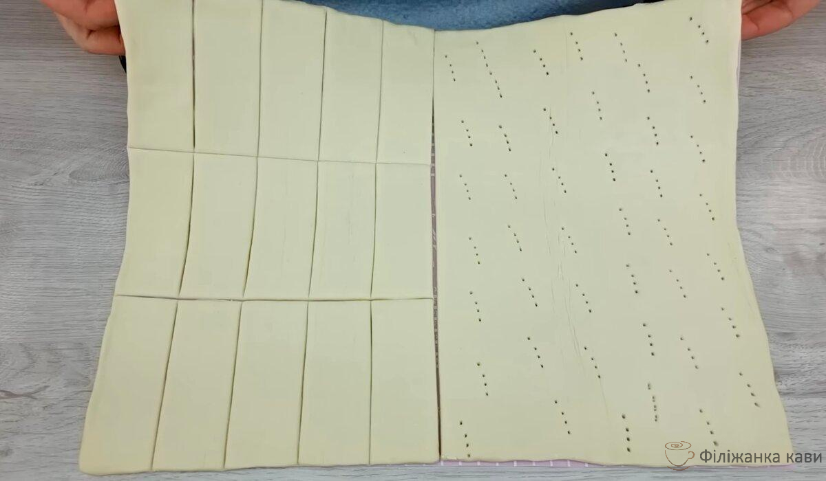 На другому прямокутнику робимо проколи виделкою. Акуратно викладаємо тісто на деко і випікаємо 15 хв, при 220 град. Дістаємо з духовки і накриваємо вологою тканиною.