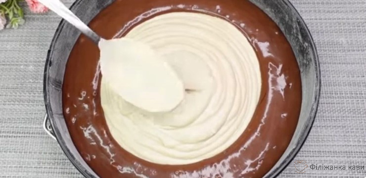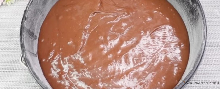 - Форму 20 см вистеляємо папером для випікання та змащуємо олією. Виливаємо шоколадне тісто.