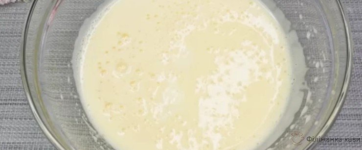 - У глибоку миску розбиваємо яйця, всипаємо цукор, сіль і перемішуємо міксером 2-3 хв. Додаємо сметану, добре змішуємо міксером.