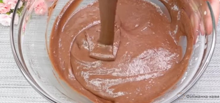 - Перемішуємо борошно з розпушувачем. Пересипаємо до яєчної маси, всипаємо какао та змішуємо лопаткою.