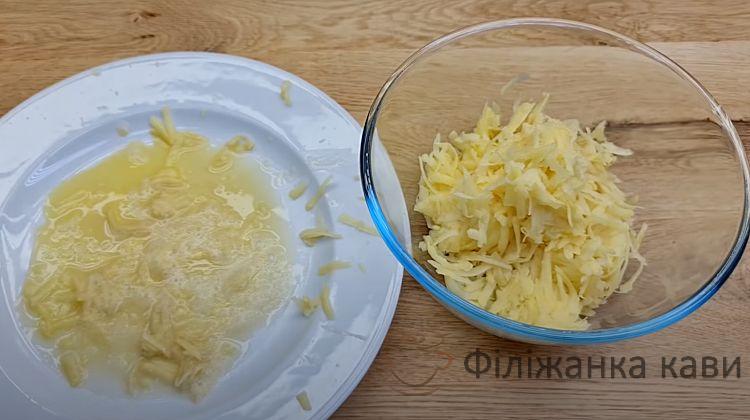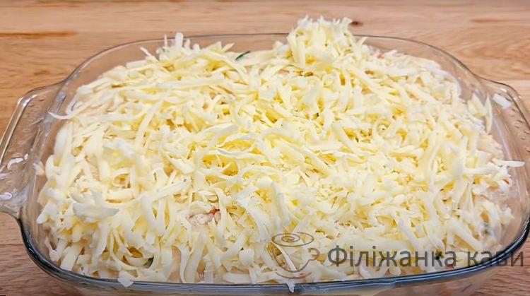 Другу половину сиру натираємо на тертці та посипаємо зверху.