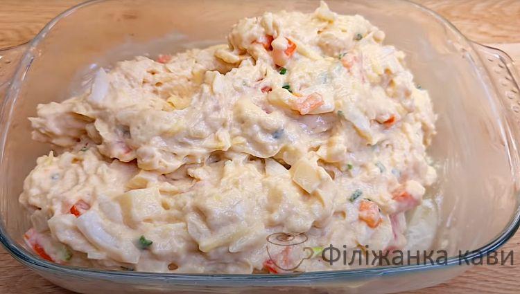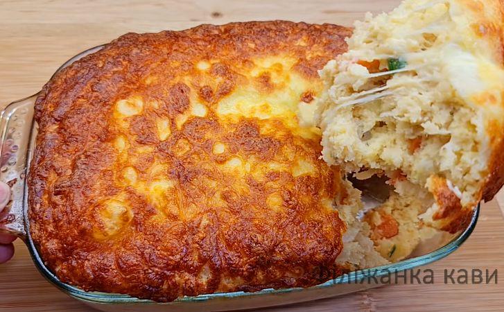 Найчастіше пиріг робиться як заготівлю з тіста та окрема начинка. Це довго і надто здобно. Ми зробимо інакше: зробимо миску салату, а потім поставимо її в духовку і вона за 30 хвилин сама перетвориться на смачний пиріг.