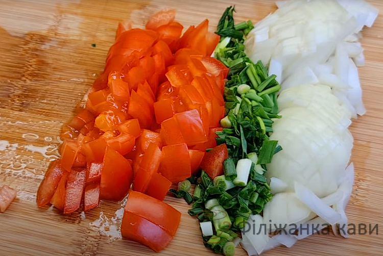 - 1 помідор і зелена цибуля, дрібно нарізаємо