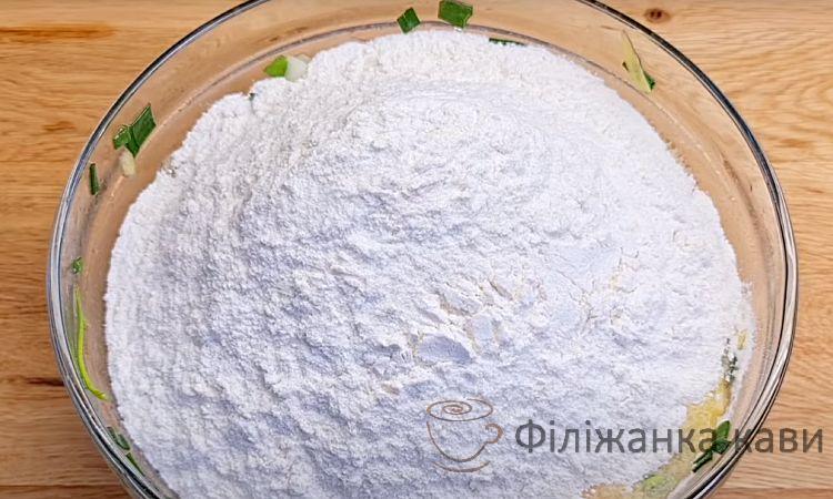 Тепер залишилося ввести сюди борошно та розпушувач. У результаті в нас вийде основа, дуже схожа на салат.
