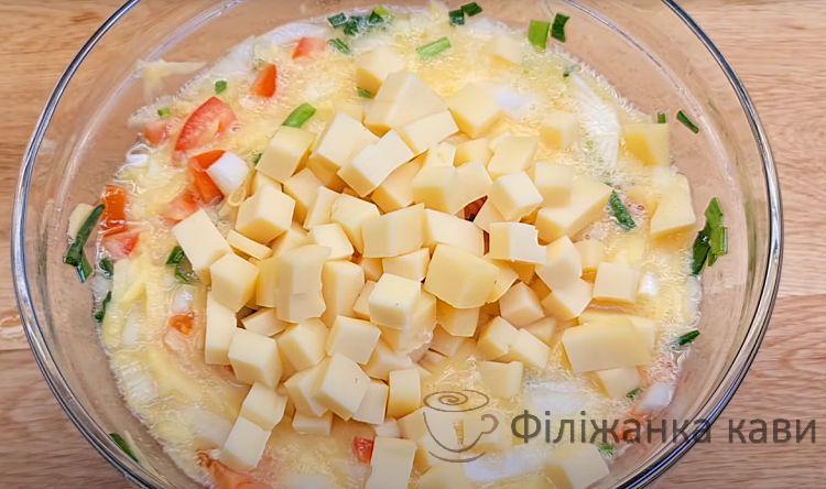 Відправляємо нарізані овочі та картоплю в миску з яйцем. Ріжемо кубиком половину сиру і додаємо зверху. Усе перемішуємо.