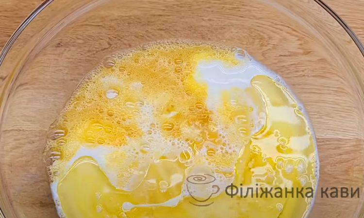 Розбиваємо 4 яйця в миску, додаємо сіль, молоко, олію та збиваємо віночком.