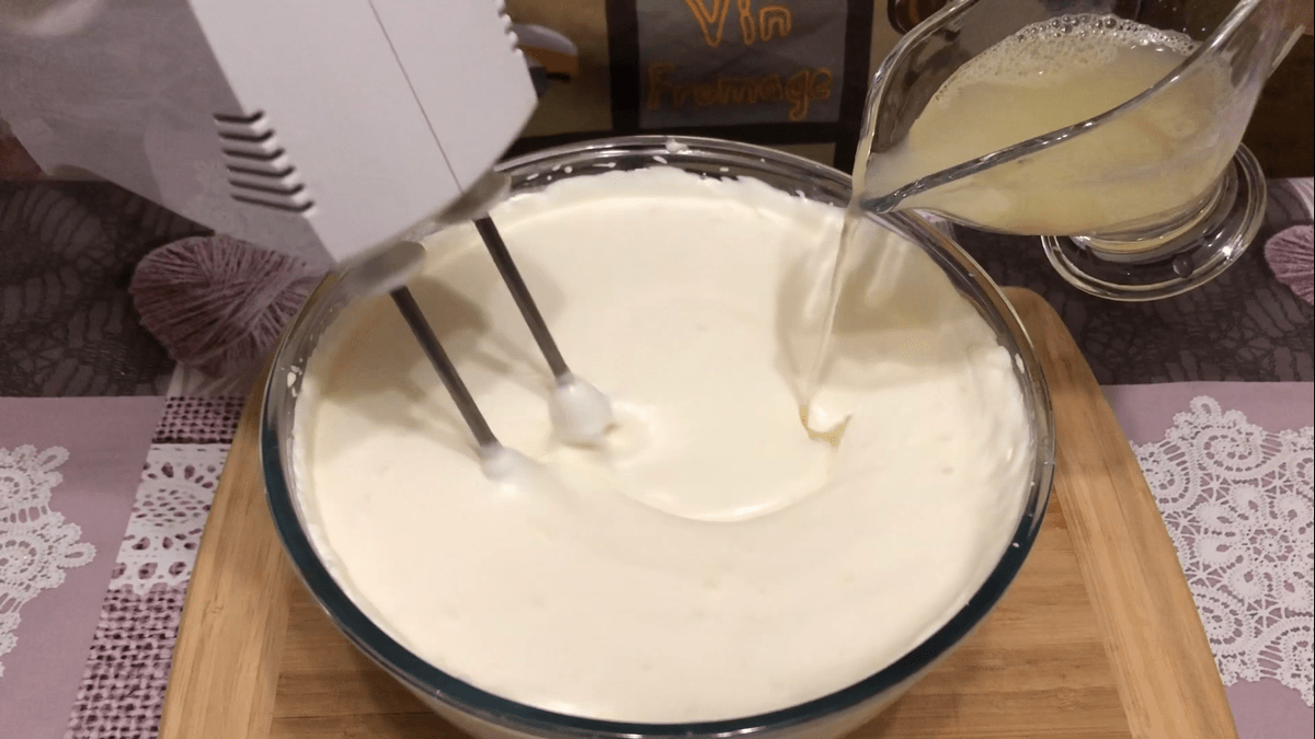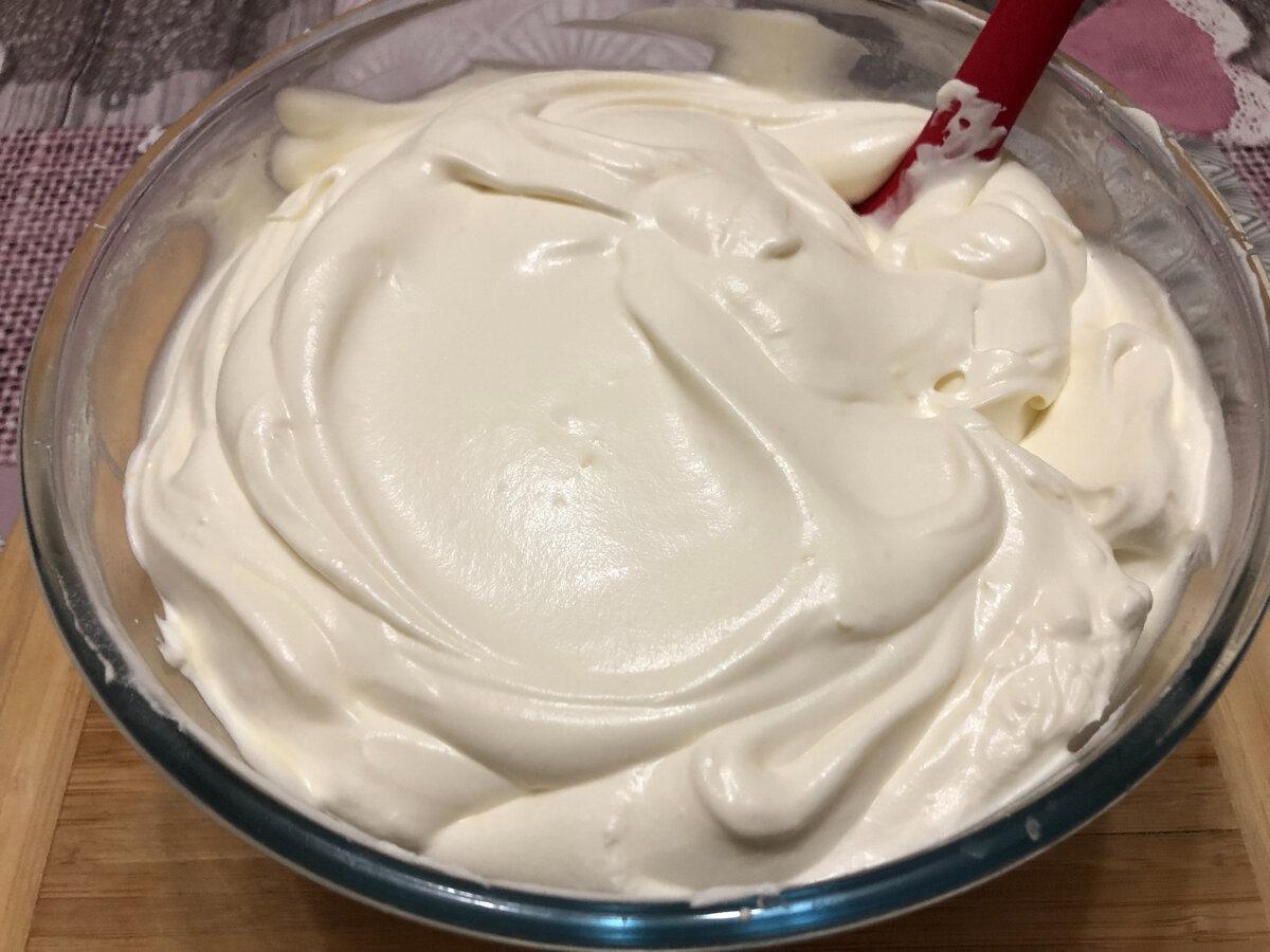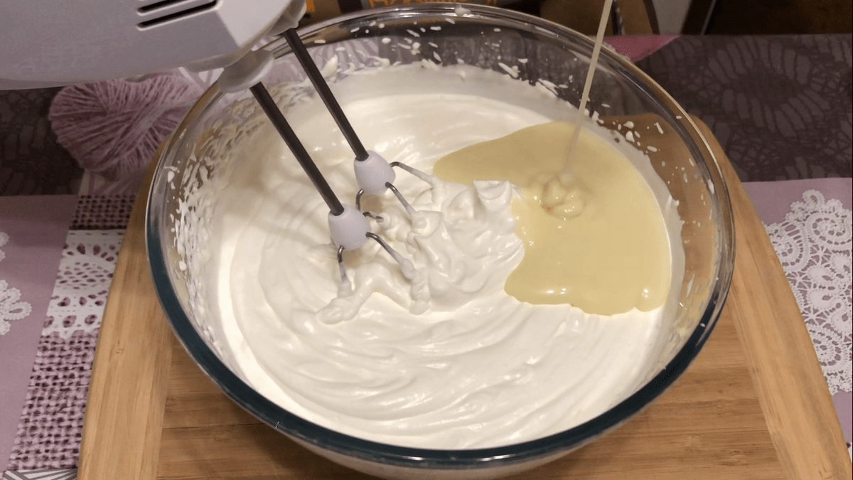 Всі продукти повинні бути холодними. Насамперед збиваємо міксером охолоджені вершки (від 30 % і вище).