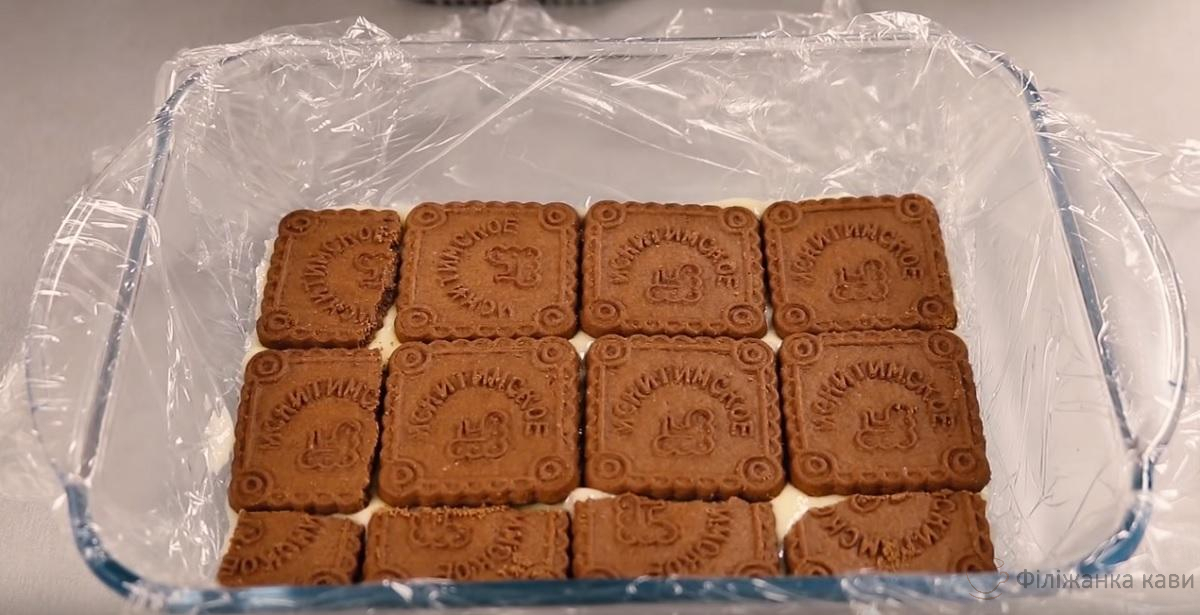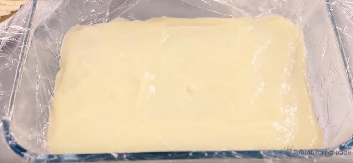 7. На перший шар крему покладіть бісквітне печиво, потім накрийте його щедрим шаром крему та шаром бананів.