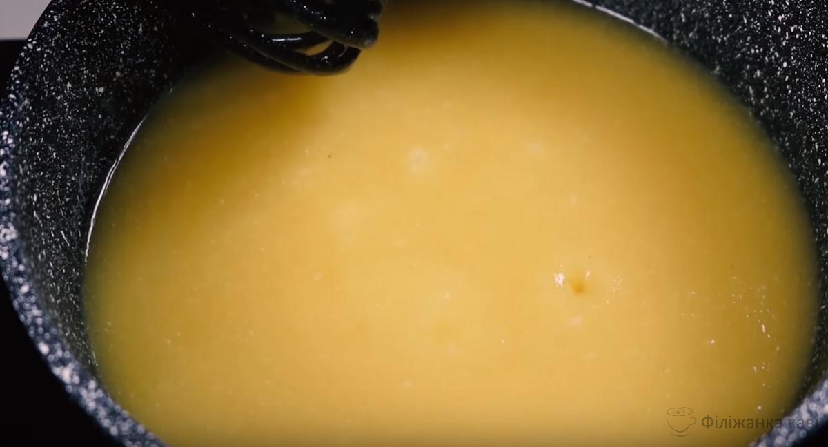 2. Варити кашу на помірному вогні до тих пір, поки вона не загусне і на її поверхні не з’являться перші бульбашки, безперервно помішуючи вінчиком.