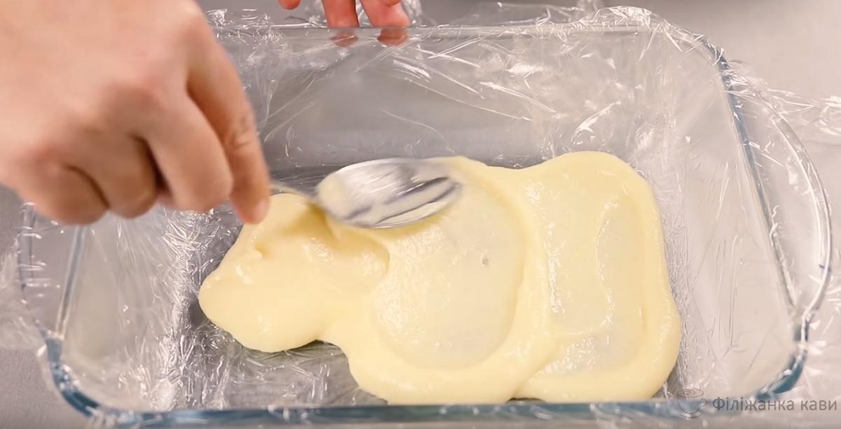 6. Зібрати торт: вистелити форму харчовою плівкою. Змастіть її дно товстим шаром крему.