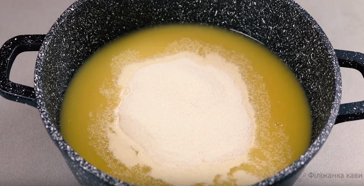 1. Приготуйте крем: апельсиновий сік вилийте в каструлю. Додати цукор і манку. Добре перемішати вінчиком. Дайте отриманому складу «відпочити» 30 хвилин.