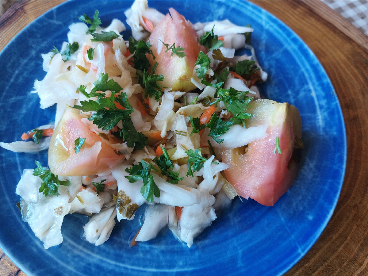 І ось, коли я поставила капусту з помідорами на стіл для проби, поливши ароматною соняшниковою олією і посипавши свіжою цибулею, її тут же з’їли і зажадали добавки. А ще дала родичам на пробу… Але ви розумієте, чому від неї за три дні не залишилося і сліду.