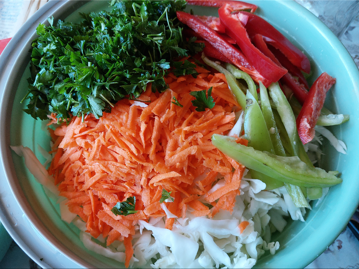 2. Капусту, моркву, болгарський перець, пастернак, зелень нарізати.
