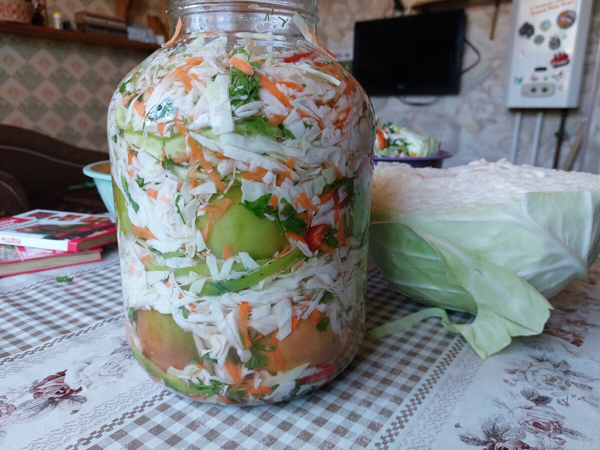 Нещодавно знайшла в зошиті рецептів моєї мами просто чудовий рецепт квашеної капусти з зеленими помідорами. Це те, що повинно стояти в зимовому запасі у кожної господині. Зробила п’ятилітрову банку і її за три дні з’їли. А треба 😂 було заховати і нікому не давати пробувати. Тепер доводиться ще робити.