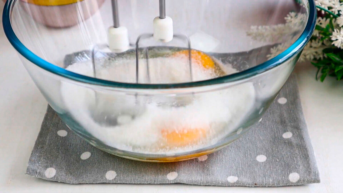 В іншу миску кладемо 2 яйця, 120 г цукру, 1 г ваніліну і щіпку солі. Збиваємо міксером до пишної білої маси.