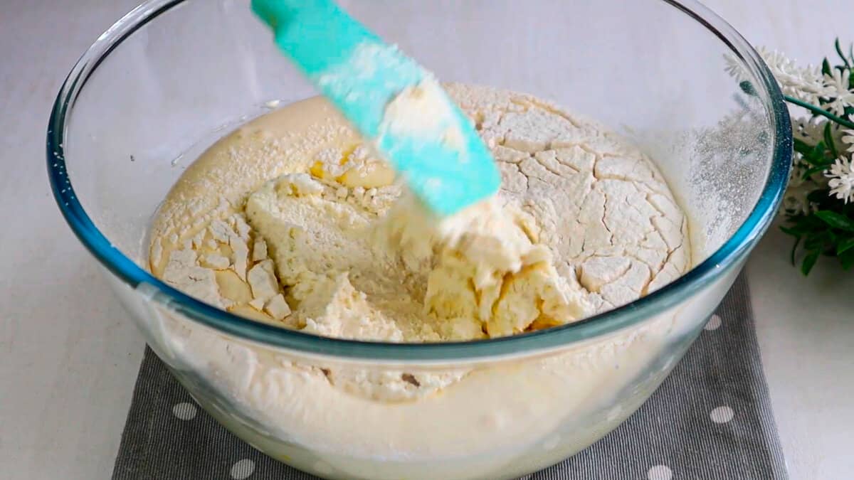 До цієї маси додаємо розтоплене вершкове масло 50 г., Просіюємо 100 г борошна, додаємо розпушувач 2 ч. л., викладаємо манну масу. Все перемішуємо міксером до однорідності.