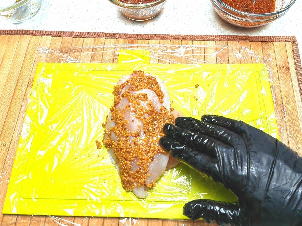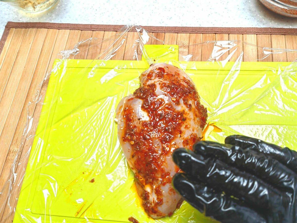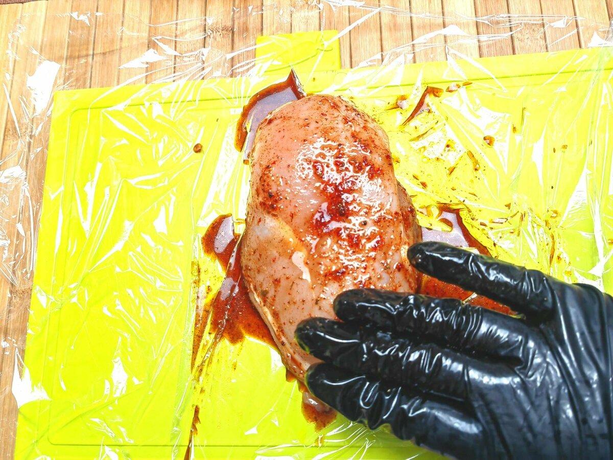 6 ) Натираємо маринадом філе. Я роблю це відразу на харчовій плівці.