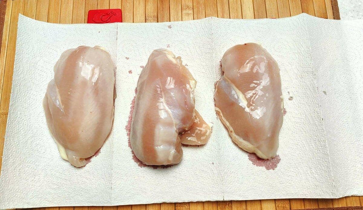 1 ) Куряче філе зачищаємо від плівок і жил ( якщо є ), наколюємо зубочисткою в декількох місцях, складаємо в ємність.