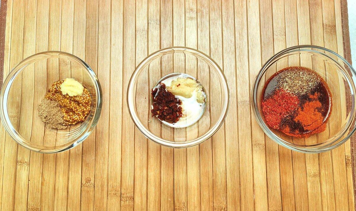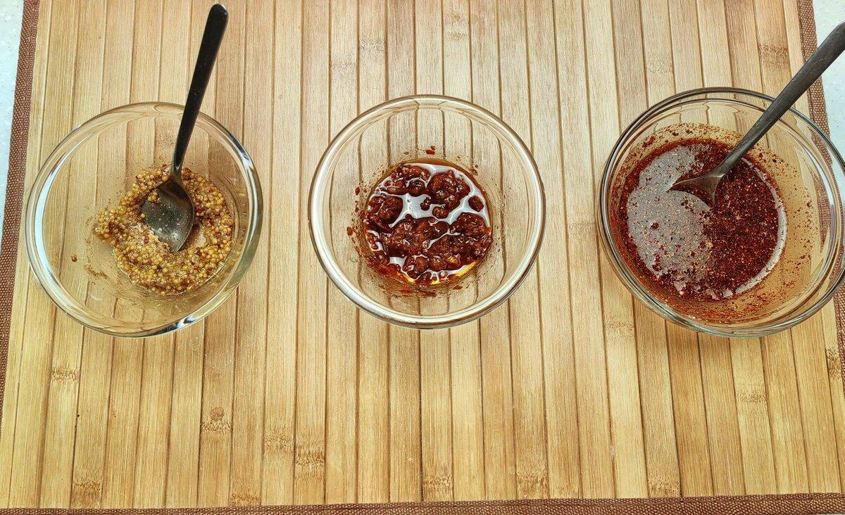 5 ) Готуємо маринад. Ви можете вибрати один на свій смак, я ж зробила три різних ( для себе, для чоловіка і для дітей )