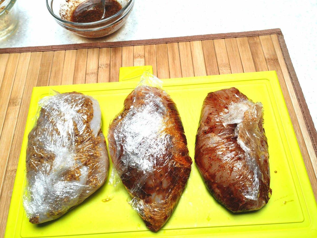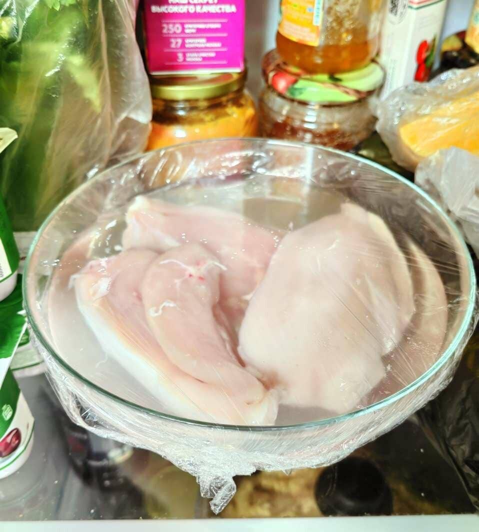 7 ) Потім загортаємо кожне філе в плівку. Складаємо в ємність і прибираємо маринуватися на 3-4 години в холодильник.