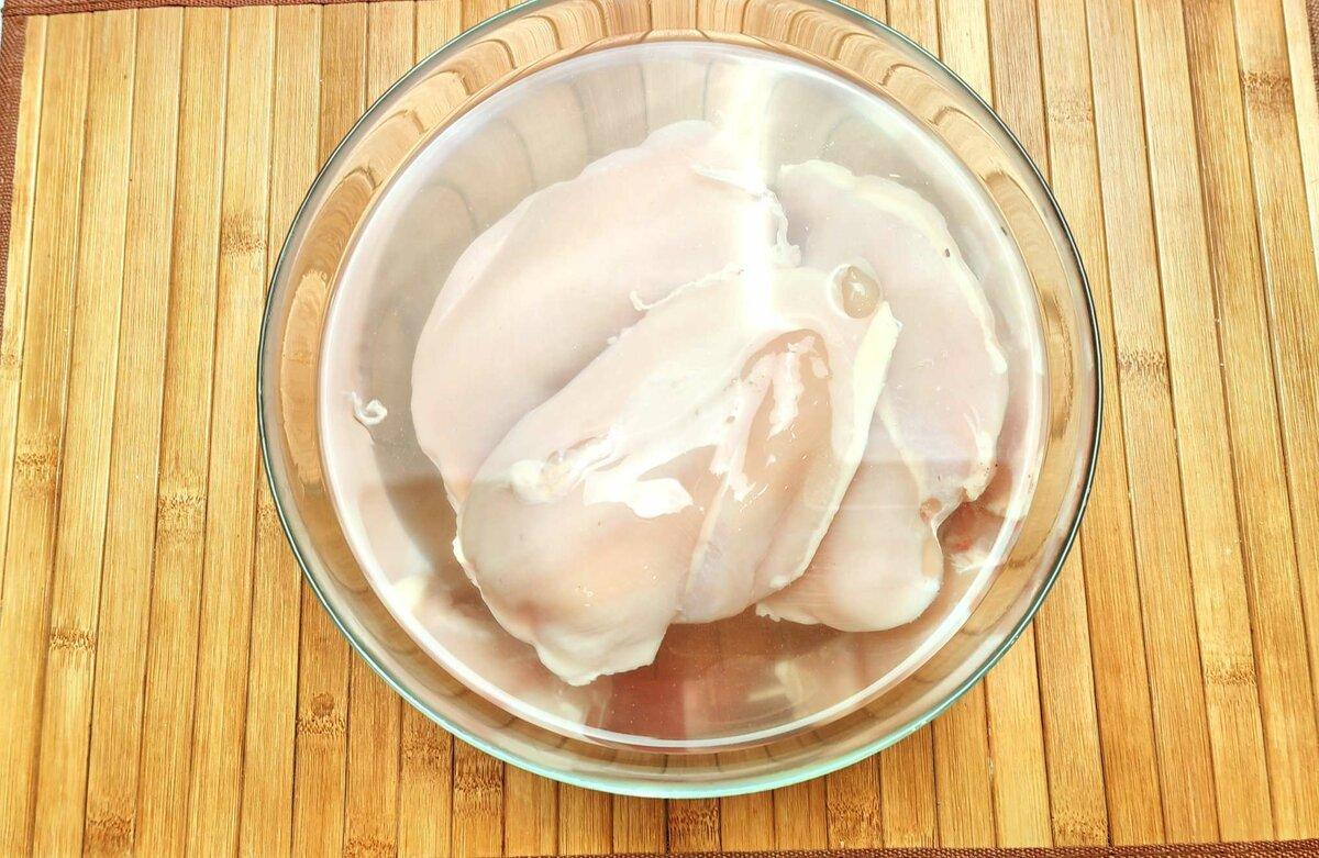 2 ) Сіль розчиняємо у воді і заливаємо розсолом куряче філе.