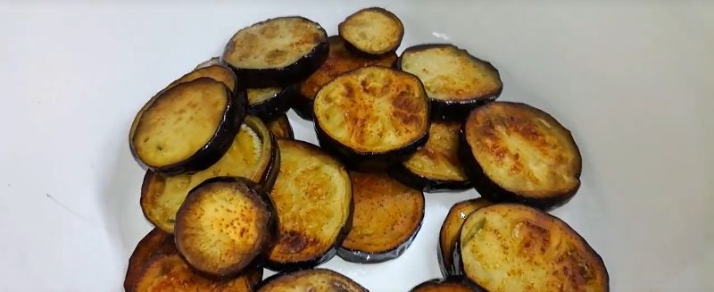 - Баклажани помити, нарізати пластинками. Підсмажити з двох сторін на олії.