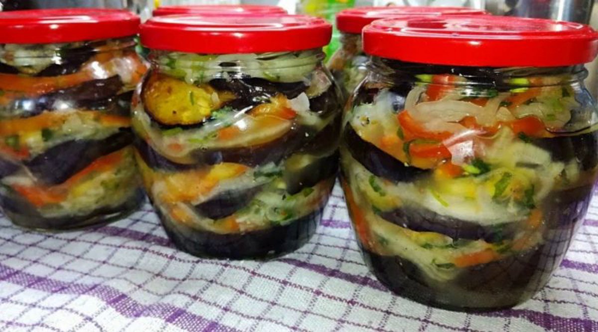 - Шарами укладаємо овочі та баклажани у стерилізовані банки.