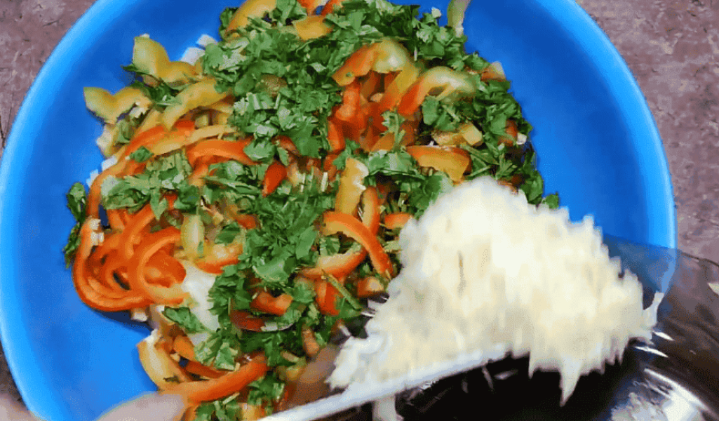 Всі сирі овочі перемішуємо, додаємо сіль, спеції та оцет. Залишаємо маринуватися на 30 хвилин, щоб виділився сік.