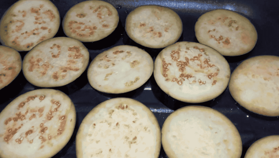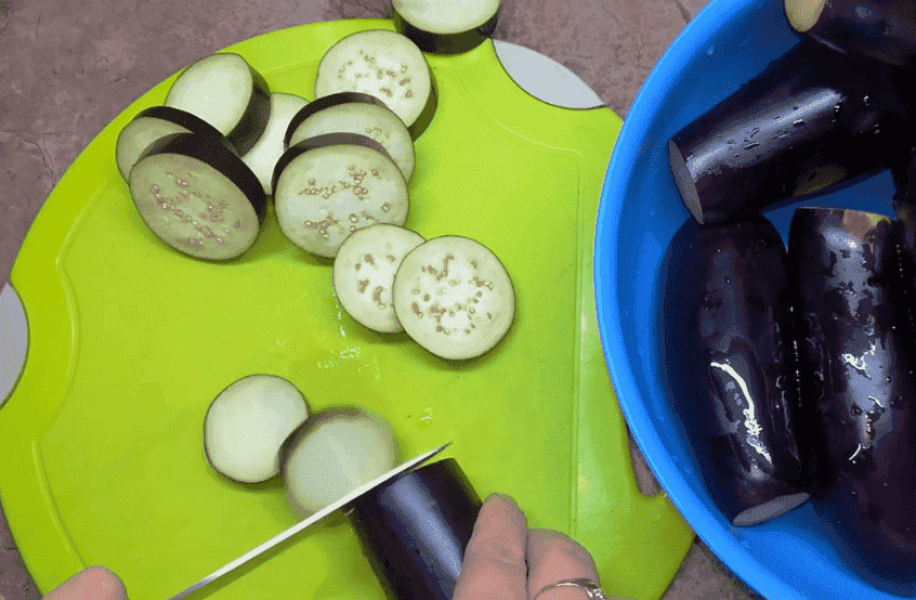 Баклажани помити, нарізати пластинками.