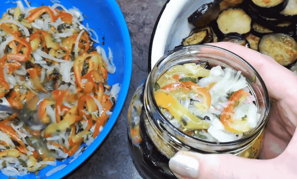 Шарами укладаємо овочі та баклажани у стерилізовані банки.