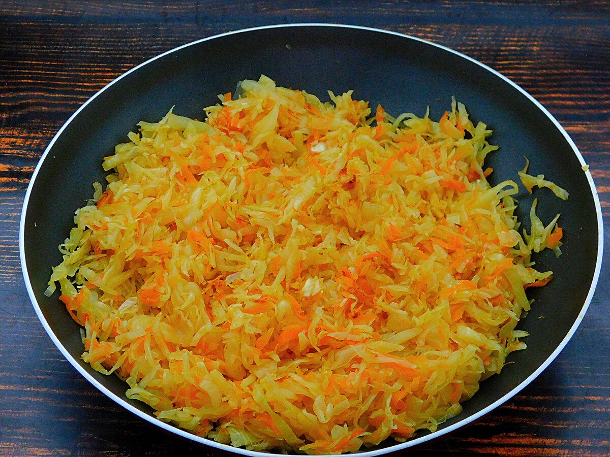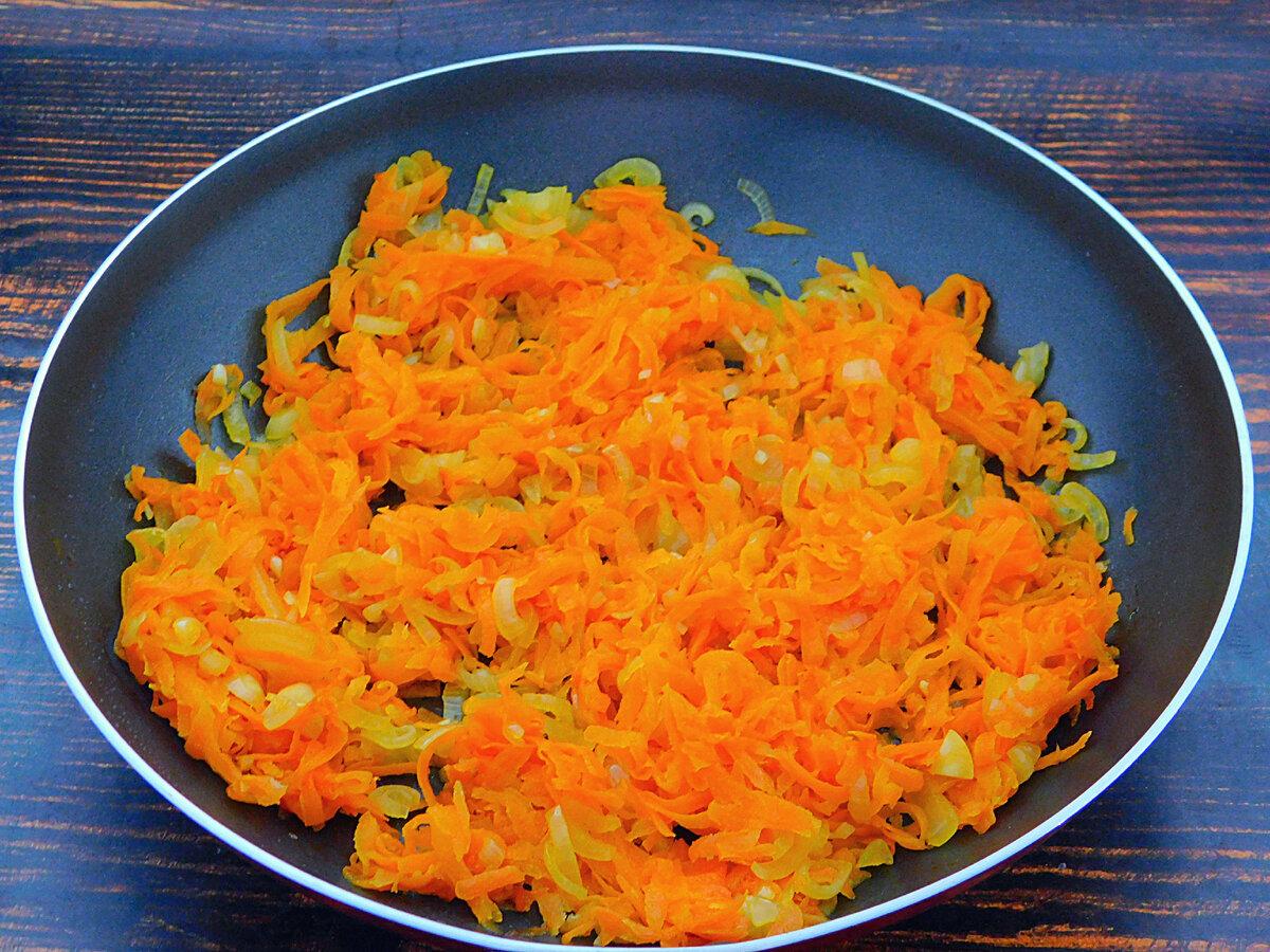 Морквину натерти на терці, цибулю нарізати чверть кільцями. Тушимо на олії до м’якості. Половину овочів відразу відкласти.