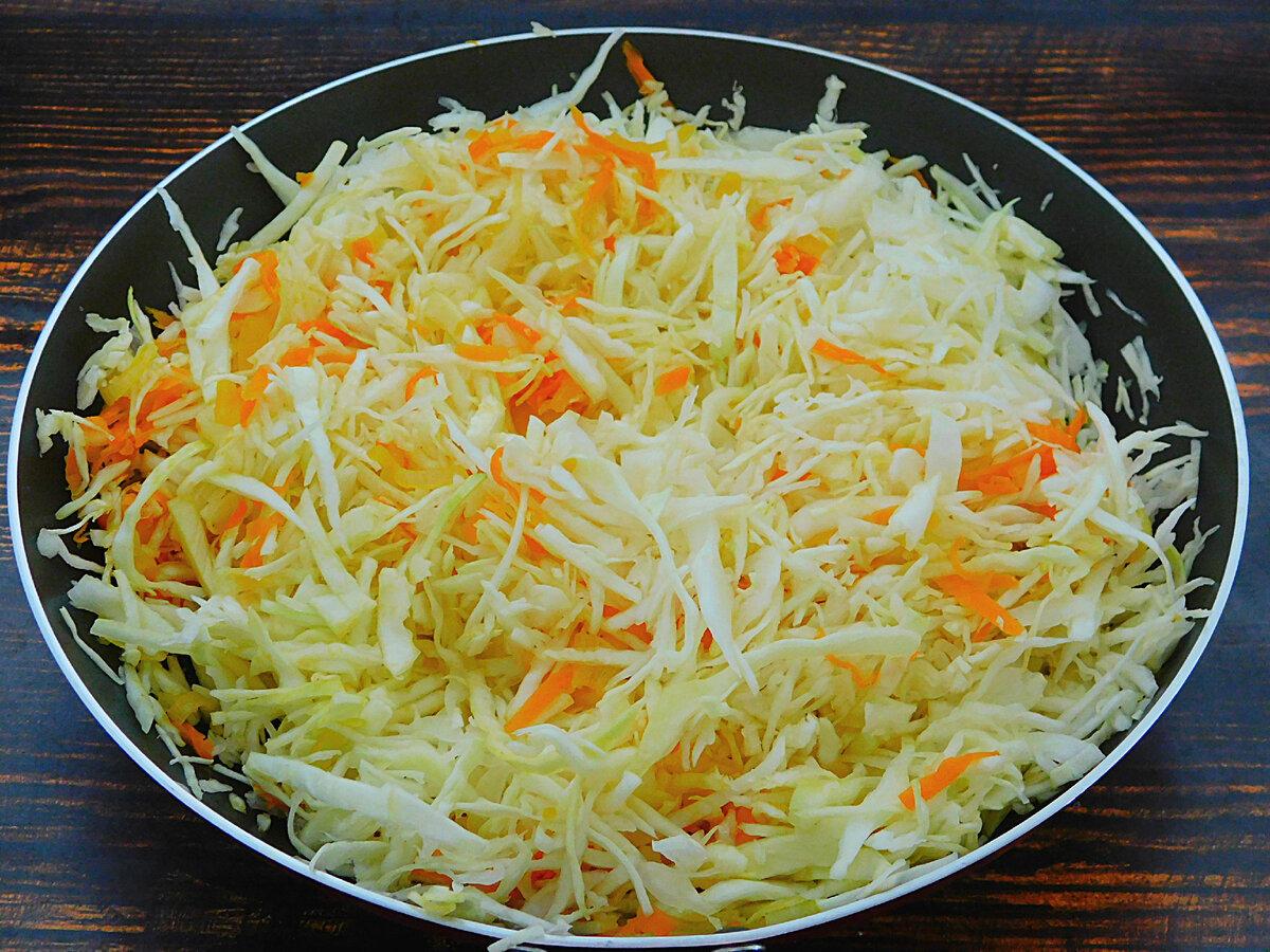 А до решти в сковорідці висипати нашатковану білокачанну капусту. Нарізка не повинна бути занадто великою.